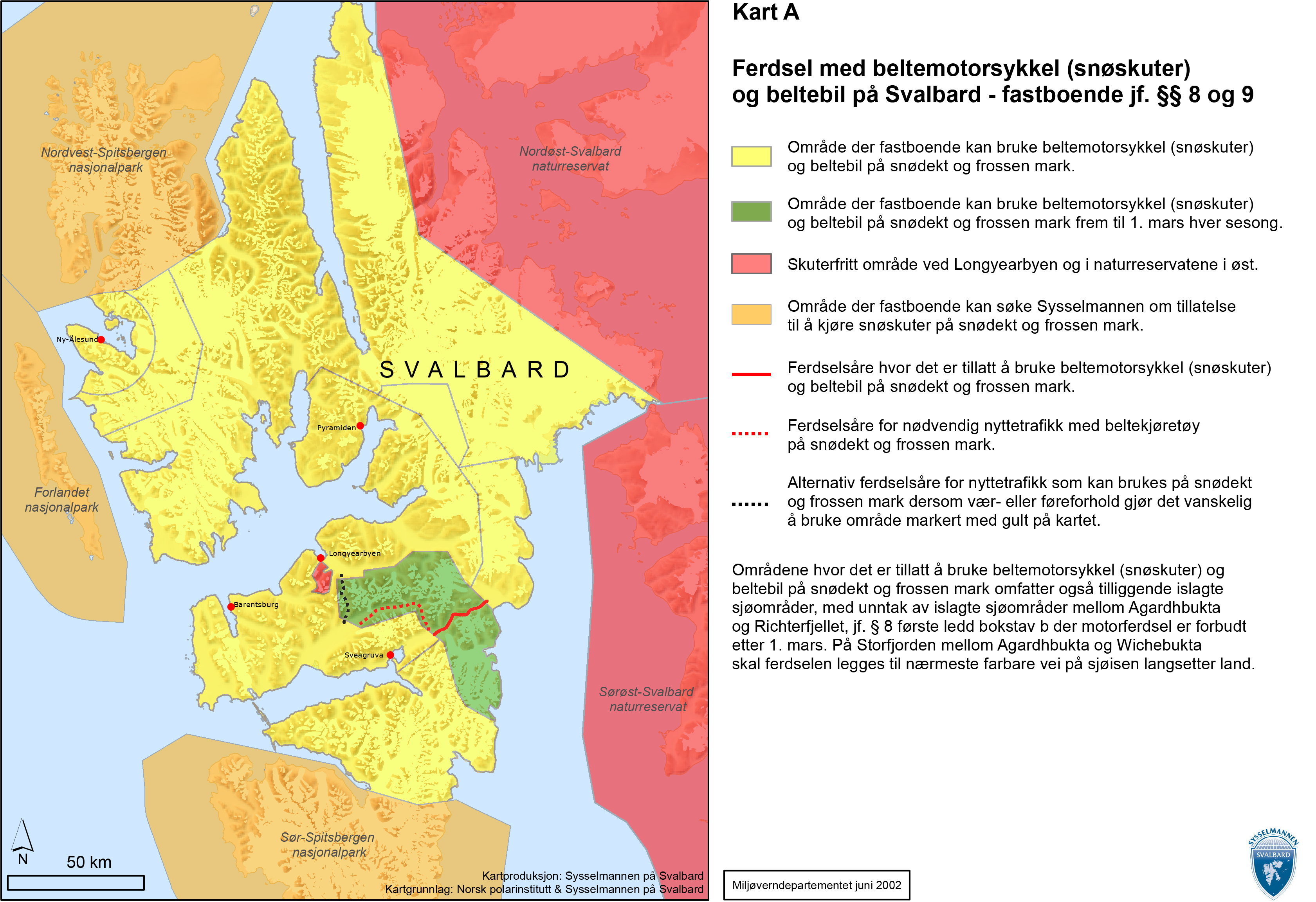 There is currently a lot of ice in the fjords on Svalbard and we remind you of the provisions of the Motor Traffic Regulations on driving on sea ice. In addition to the temporary traffic restrictions that have been introduced in Tempelfjorden, Billefjorden and Dicksonfjorden, and regulation of traffic on sea ice in Van Mijenfjorden National Park in Svalbard, we draw particular attention to regulation of traffic on iced sea areas between Agardhbukta and Wichebukta. Here, the traffic must be on the passage closest to land, and it is not allowed to drive out onto the sea ice in these areas. We also remind you that driving in the nature reserves in the east of Svalbard is prohibited, see map A of the Motor Traffic Regulations.