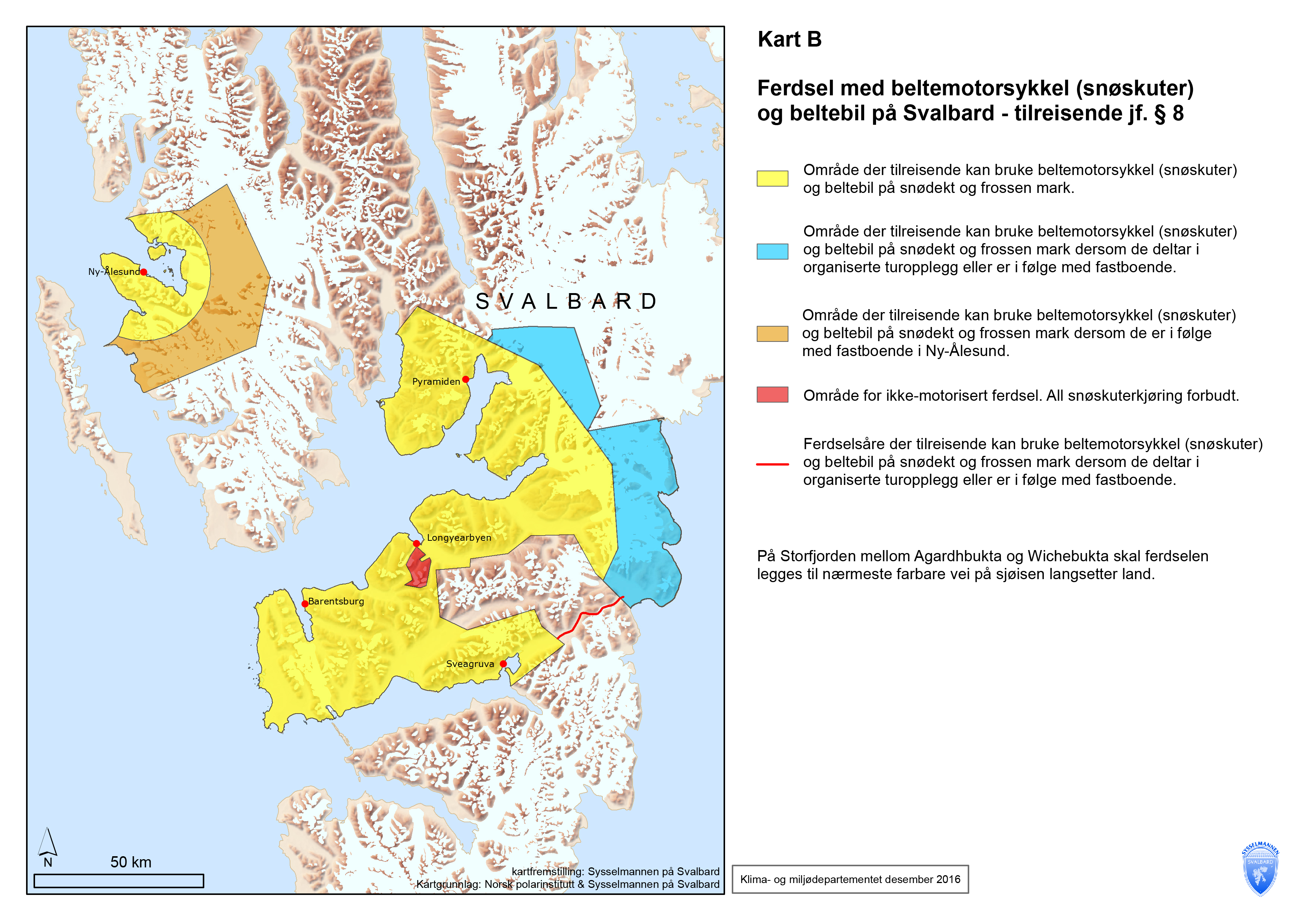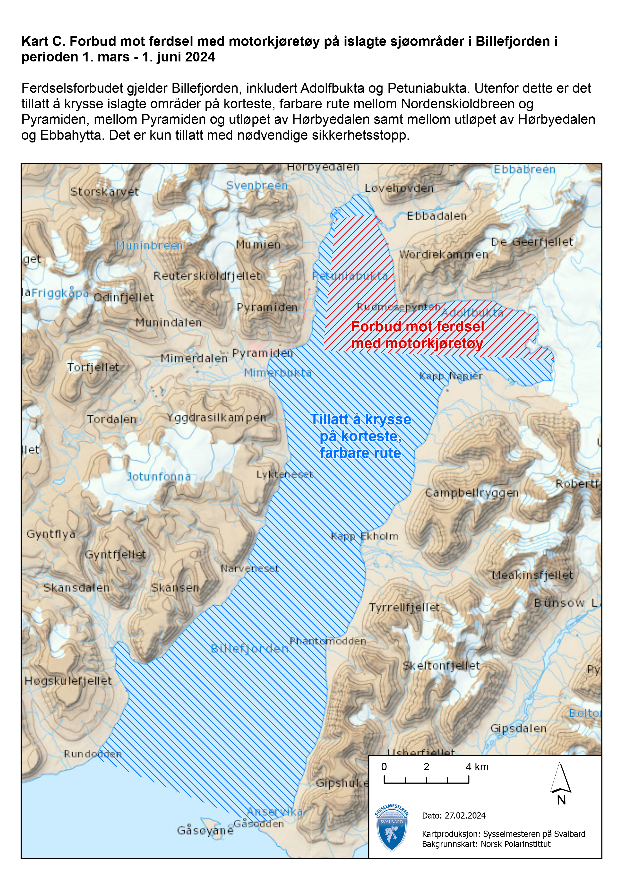 In ice-covered sea areas in Billefjorden, Petuniabukta and Adolfbukta, motor vehicle traffic is prohibited until 1 June 2024. It is permitted to cross ice-covered areas in Billefjorden with snowmobiles on the shortest navigable route between Nordenskiöldbreen and Pyramiden and beyond this, between Pyramiden and the outlet of Hørbyedalen and between the outlet of Hørbyedalen and Ebbahytta, shown on map C. When crossing frozen sea areas in line with this provision, only necessary safety stops are permitted.