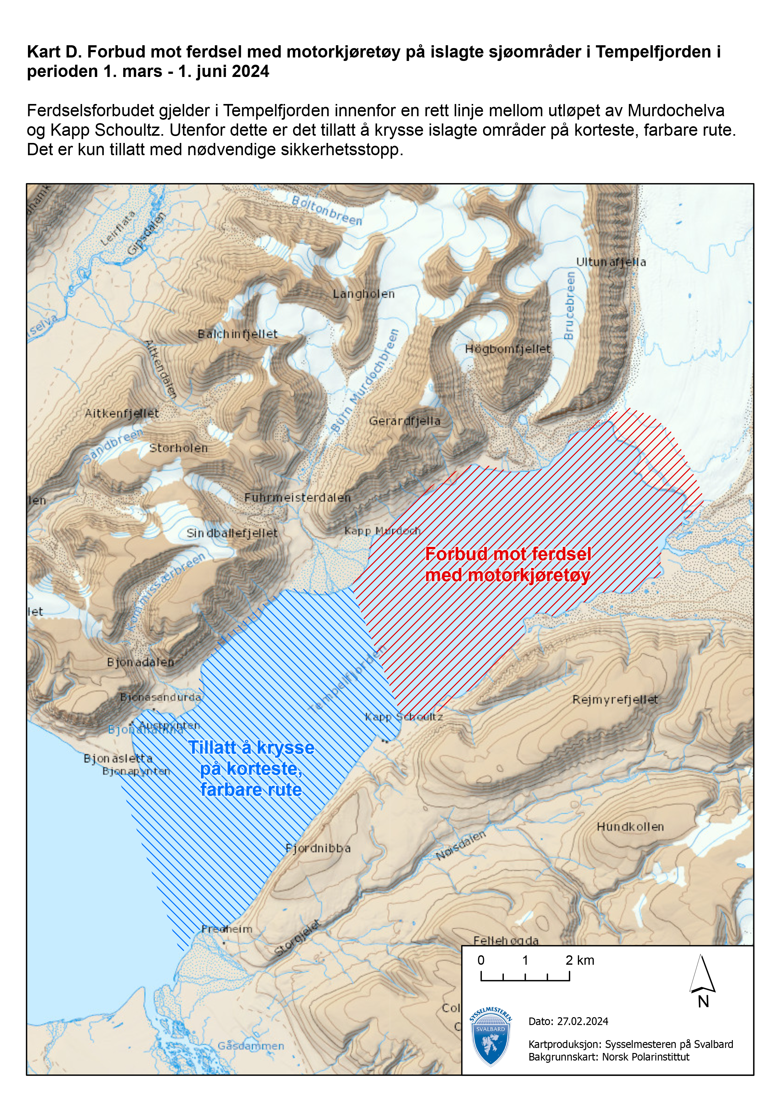 On ice-covered sea areas in Tempelfjorden, within a straight line between the outlet of the Murdochelva and Kapp Schoultz, there is a ban on motor vehicle traffic until 1 June 2024, shown on map D. Outside this area, it is permitted to cross ice-covered areas in Tempelfjorden with snowmobile on the shortest possible route. When crossing frozen sea areas in line with this provision, only necessary safety stops are permitted.