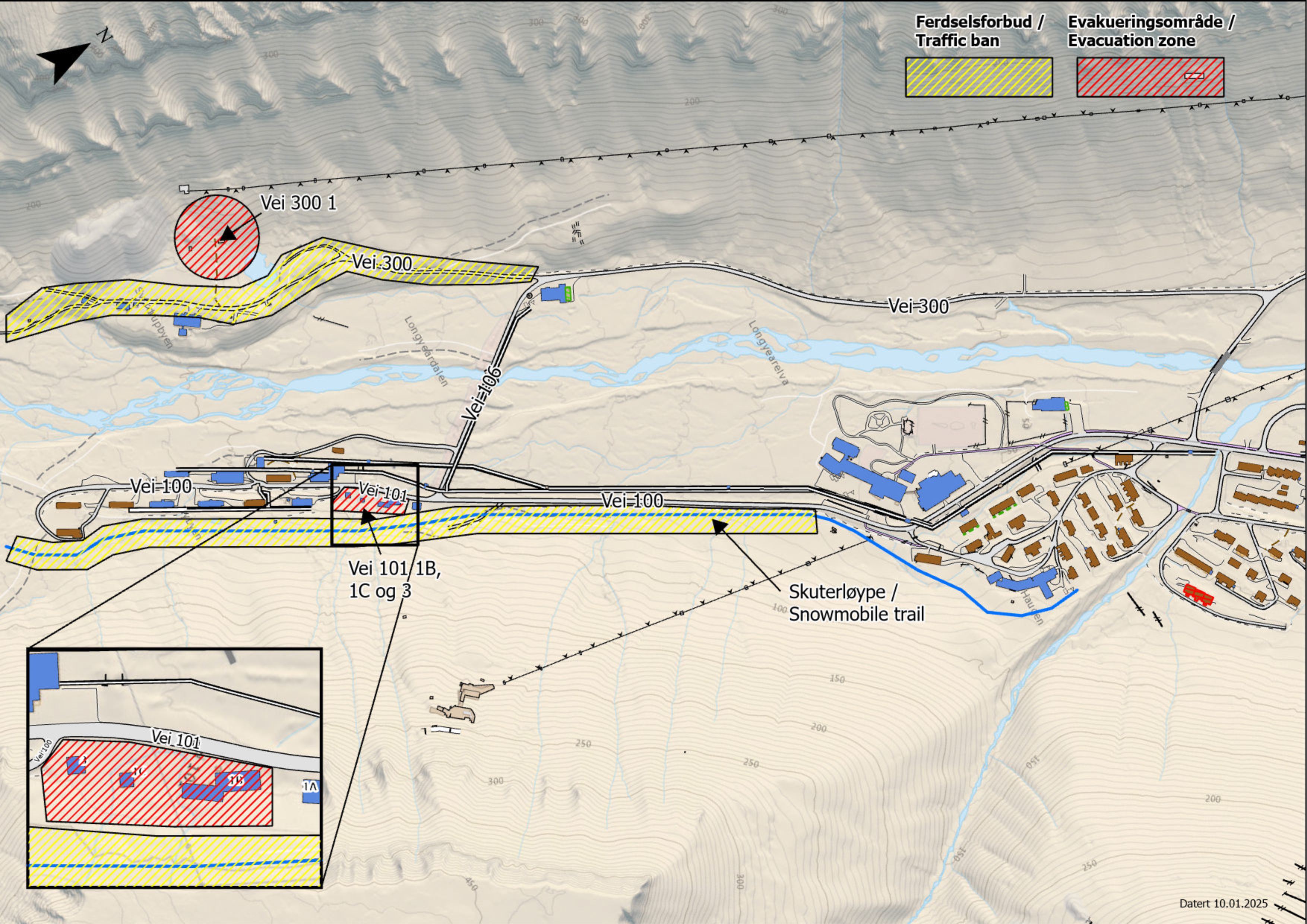 Basert på faglige vurderinger fra Skred AS og værprognosene har Sysselmesteren besluttet å evakuere enkelte bygninger i Nybyen, samt et bygg i Sverdrupbyen. Det innføres oppholds- og ferdselsforbud i skutertraseen på østsiden (oversiden) av Vei 100 fra Longyearbyen skole til og med Nybyen. Vei 300 stenges også fra krysset ved Huset og opp til Gruvelageret.
